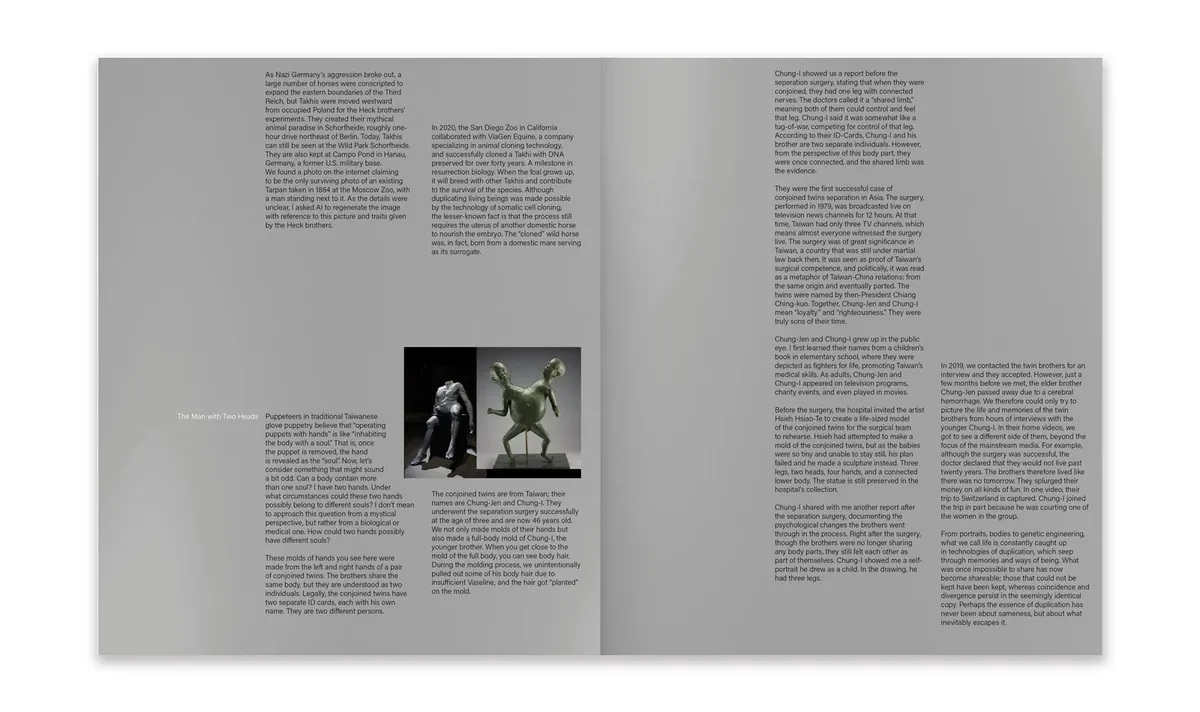The publication also features two essays: One is a lecture-performance script co-written with dramaturg Betty Yi-Chun Chen, first presented at Theater der Welt in Germany in 2023. The other is a conceptual essay “A Few Exercises in Mourning and Notes on Catastrophism,” co-authored by the artists as a reflection on the philosophical underpinnings of the irrecent works.